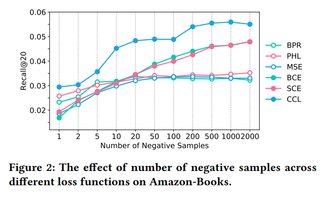 本文还分析了负样本数量对实验结果的影响。可以看到BPR损失随着数量的增加性能几乎没啥变化,而所提出的CCL损失则可以比较好的利用数量比较多时的负样本。
