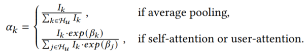 其中 表示物品 的隐特征向量, 为指示函数, 表示聚合权重。根据聚合方式可以计算聚合权重: