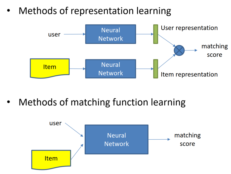 根据何老师的教程可以大致将交互编码器模块分为表示模块(Representation learning)和匹配模块(Matching function)。其中表示学习模块主要负责学习用户和物品的特征表示,比如MF、Item2vec以及DSSM等,匹配模块主要用来学习两者之间的交互关系,从简单的内积、余弦相似度到复杂的MLP等机制。