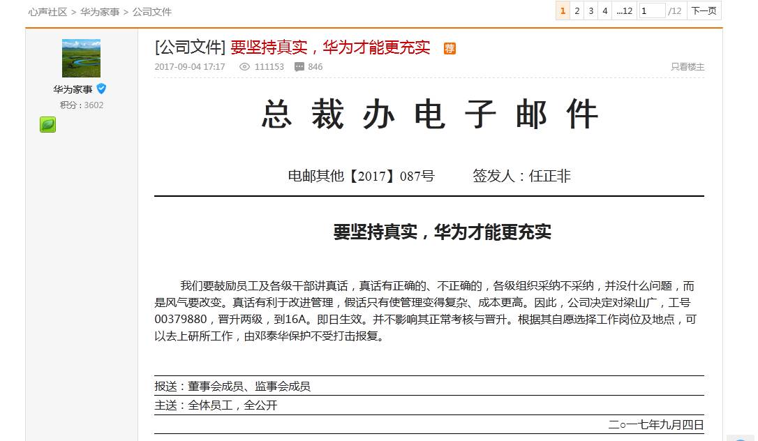 这则新闻来源于华为集团“心声社区”中贴出的一封由华为总裁任正非签发、名为《要坚持真实,华为才能更充实》的内部邮件,于是作为“游客”的小编麻溜的去瞧了瞧: