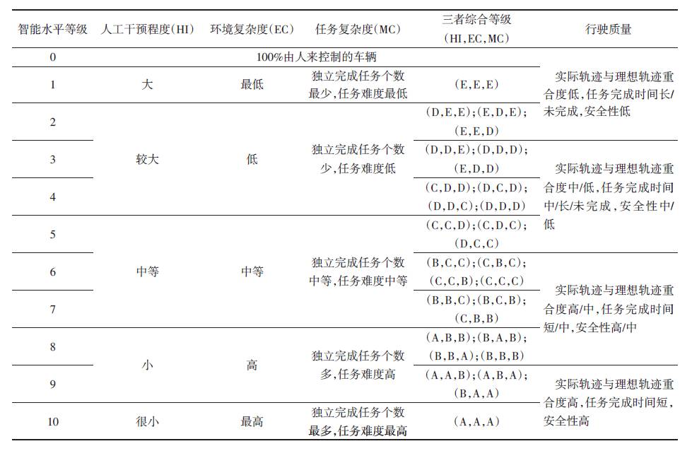 无人驾驶车辆智能行为的表现直接决定了无人驾驶车辆智能水平等级。对无人驾驶车辆智能水平的评价取决于环境复杂度、任务复杂度、人工干预程度、行驶质量(表1)。如表1所示,无人驾驶车辆的综合等级对应10个智能水平等级,根据综合等级的高低(A最高,E最低)来评价无人驾驶车辆智能水平高低(例如,如果任务复杂度最高、环境复杂度最高、人工干预度最小,则综合等级为(A,A,A))。
