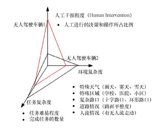 无人驾驶车辆对环境的识别往往是评价其智能水平最紧密的参数之一。无人驾驶车辆的智能水平等级根据对无人驾驶车辆的行车行为表现以及交通行为表现的分析来进行划分。真实道路具有复杂性和不可预测性。无人驾驶车辆的认知能力与交通环境的变化有关。根据车辆行驶环境,将环境复杂度进行5等级划分。一级(环境复杂度最低):简单道路(直道),路况平坦(无坑洼),天气良好,光照良好,行人少,路口少,交通灯、交通标志少。二级(环境复杂度低):一般道路(直道,弯道),路况一般(有较小坑洼),光照一般,动态行人较多,较复杂路口,有交通灯、交通标志。三级(环境复杂度中等):较复杂道路(简单车道线,减速带等),路况较恶劣(车辙,坑槽,路面破损等),光照较弱,动态行人多,相对复杂路口,交通灯、交通标志较多。四级(环境复杂度高):复杂道路(复杂车道线,绿化带,分离带等),路况恶劣(泥泞土路,松散沙路,水坑等),阴天,光照弱,较多动态的行人、机动车及非机动车等,复杂路口,交通灯、交通标志多。五级(环境复杂度最高):特别复杂道路(立交桥,各种车道、匝道,指示牌,道路信息牌等),路况极端恶劣(积水,积雪,落叶、遗撒物等障碍物覆盖),雨天、雪天、雾天等极端天气,光照最弱,动态行人最多(学校,医院,拥挤路口等),有高速行驶车辆,极其复杂路口,交通灯、交通标志最多。