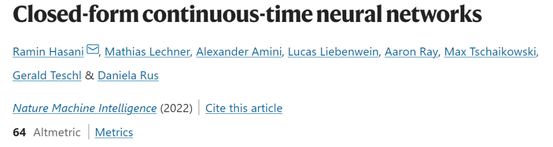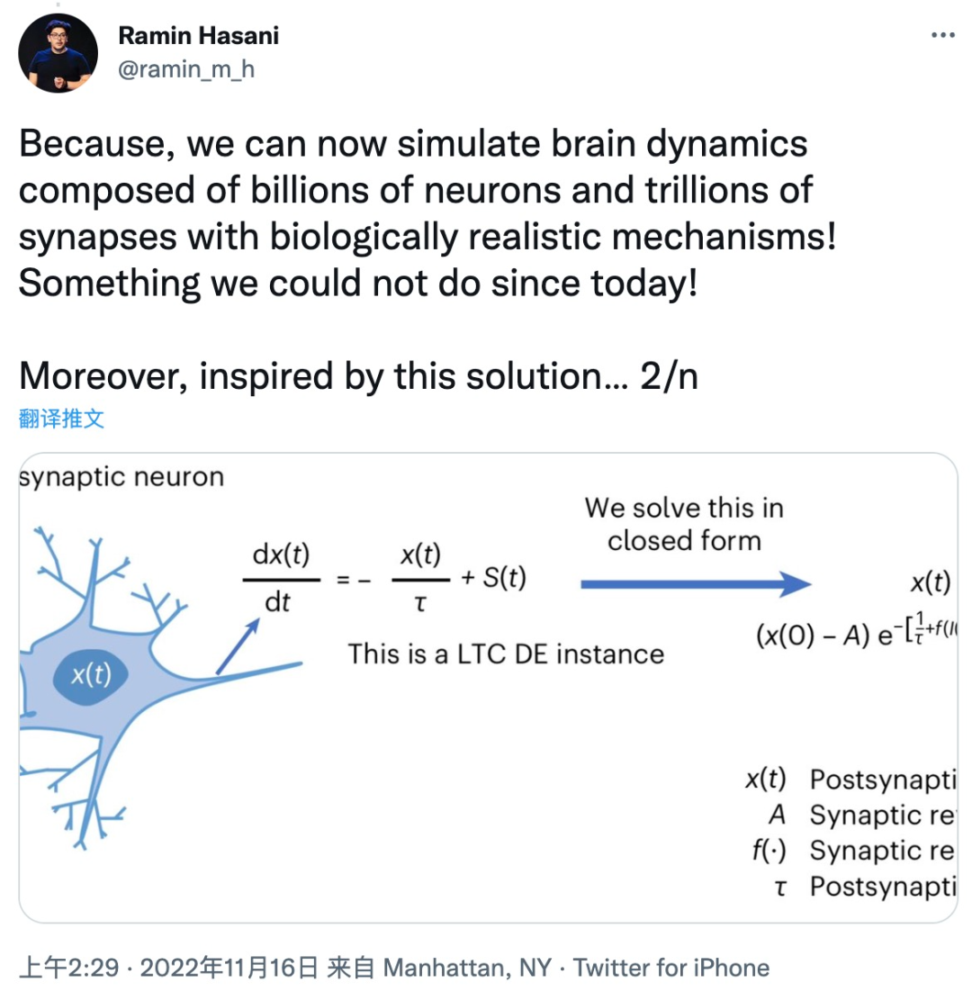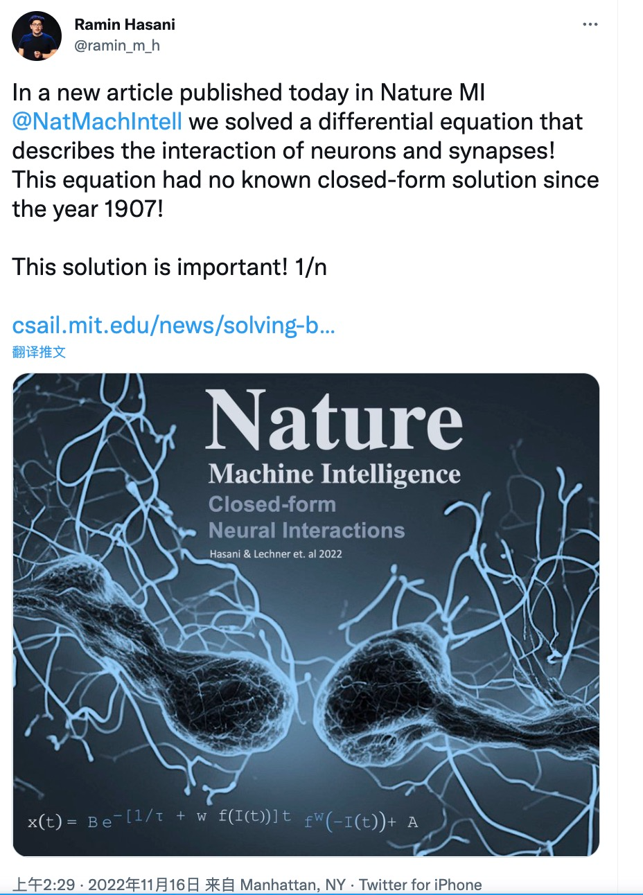 这种 closed-form 的近似方法让该研究成功求解了描述神经元和突触相互作用的微分方程,而这是自 1907 年以来首次攻克这一数学难题,将让神经网络的研究获得质的飞跃。论文第一作者、MIT CSAIL 研究科学家 Ramin Hasani 也在推特上激动地发文称解决了这个百年难题。