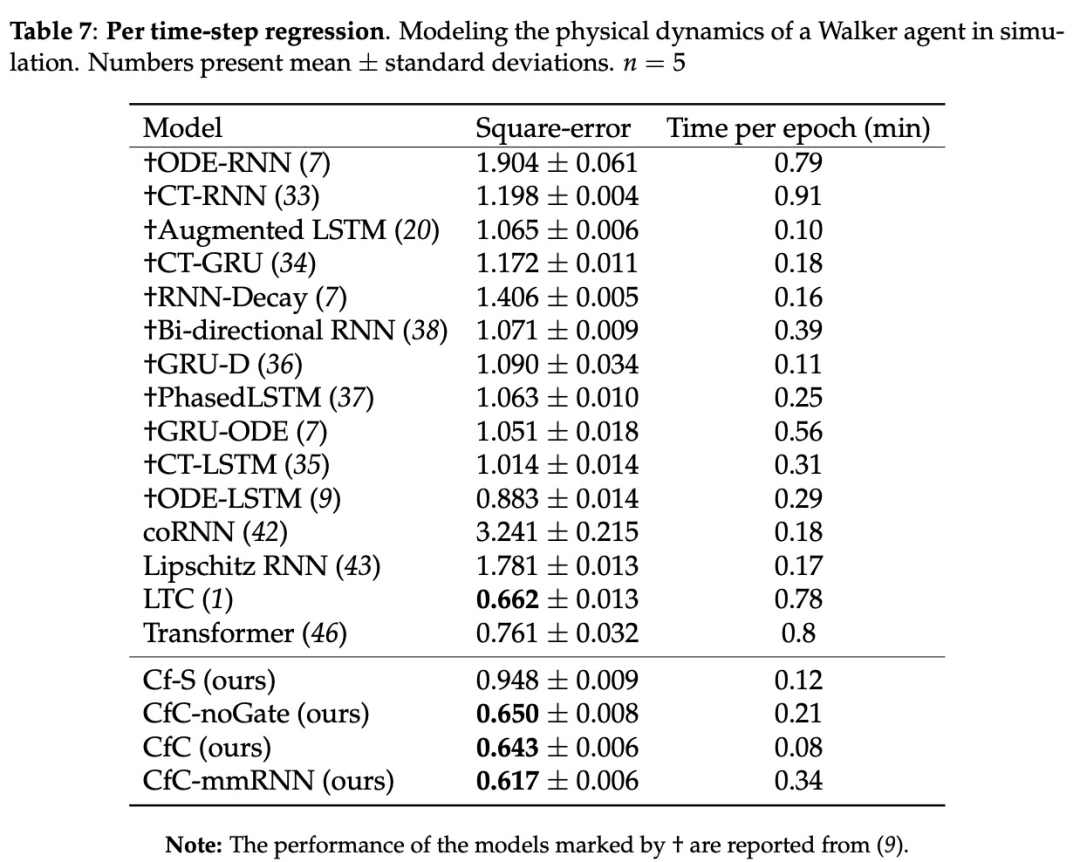 该研究还让几种模型模拟步行机器人的物理动力学,其中 CfC 模型的性能显著优于其他基线模型: