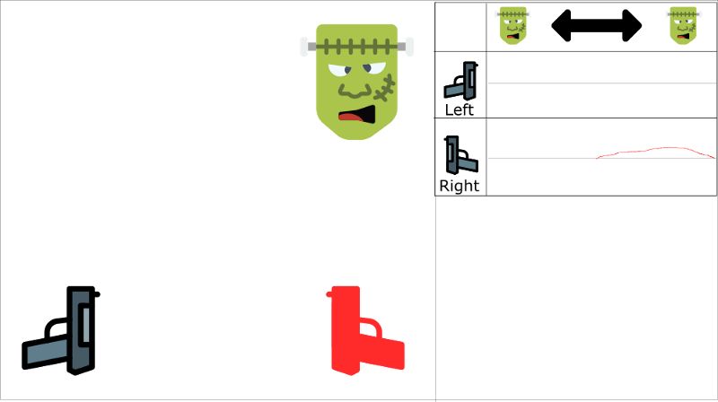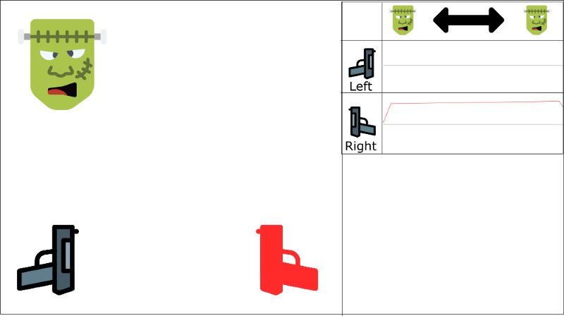 然后下一个怪物也来自右边(概率为70%),智能体将使用右枪射击。再次命中,这很好!