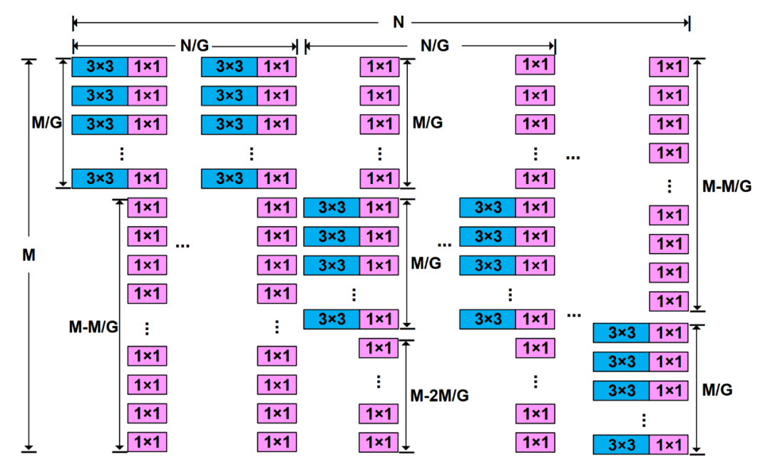 DualConv的结构如图1所示,将N个DualConv卷积滤波器分为G组,每组N/G个卷积滤波器对M/G个输入特征映射图通道同时做3×3卷积和1×1卷积,而对剩下的(M-M/G)个通道只做1×1卷积。DualConv可以视为3×3组卷积和1×1点卷积的组合,因此可以很容易地集成到现有的深度神经网络架构中。