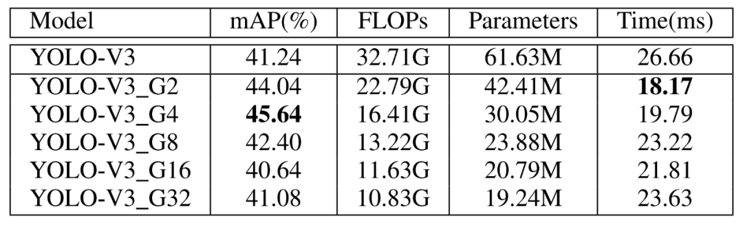 由以上结果可以看出DualConv能够应用于标准深度神经网络架构和轻量级深度神经网络架构,且在各个图像分类数据集上有很强的泛化能力。为了验证DualConv可以泛化到不同的任务,我们将DualConv进一步应用于目标检测的YOLO-V3模型。