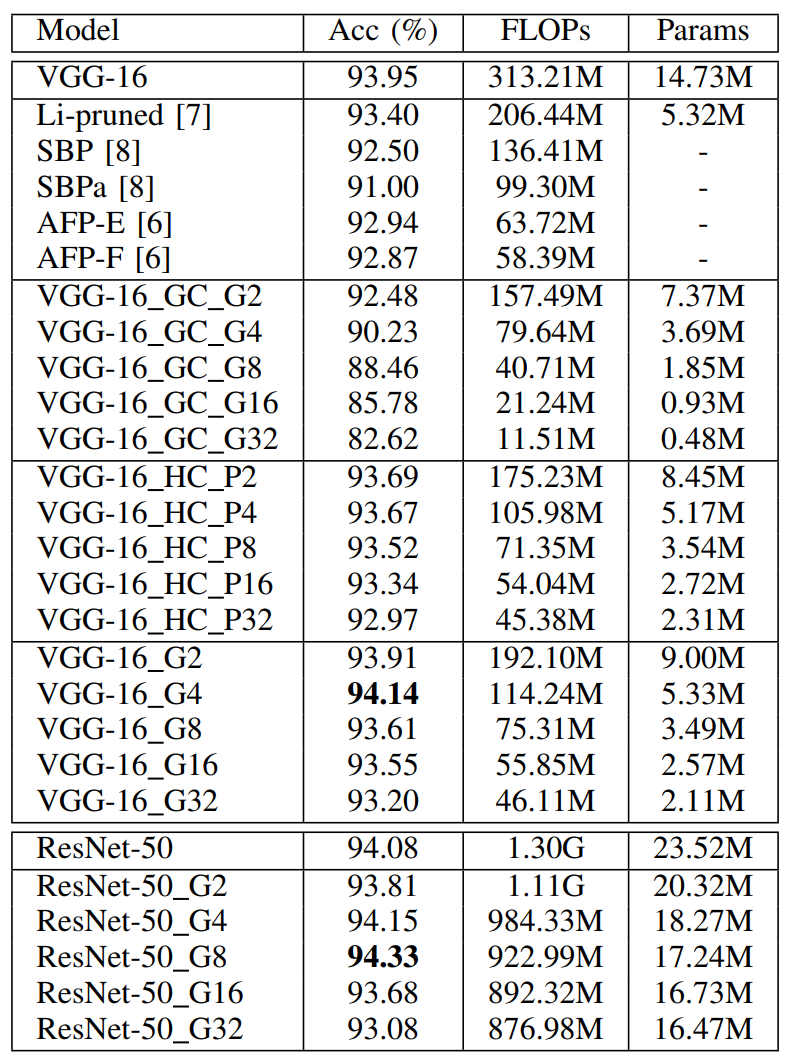 表 1 DualConv应用于VGG-16和ResNet-50在CIFAR-10数据集上的性能比较(VGG-16(ResNet-50)_Gα代表使用DualConv修改的VGG-16或ResNet-50网络,VGG-16_GC_Gα代表组卷积修改的VGG-16,VGG-16_HC_Pα代表异构卷积修改的VGG-16,其中α表示DualConv和组卷积的组数G或异构卷积的参数P。)