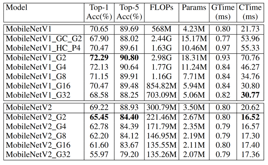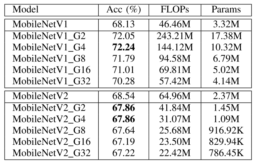 从表1我们可以看出,DualConv对比其他方法有更高的准确度。在加大组数G,进一步降低深度神经网络参数量和计算量的同时,只损失一点准确度性能。