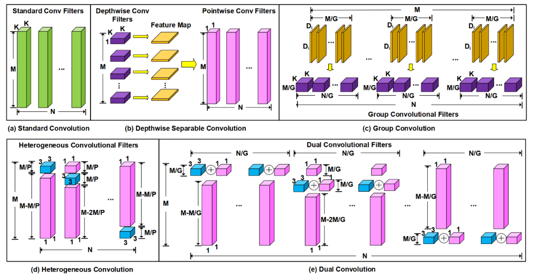 图 2 (a) 标准卷积、(b) 深度可分离卷积、(c) 组卷积、(d) 异构卷积、(e) 双卷积的卷积层结构图