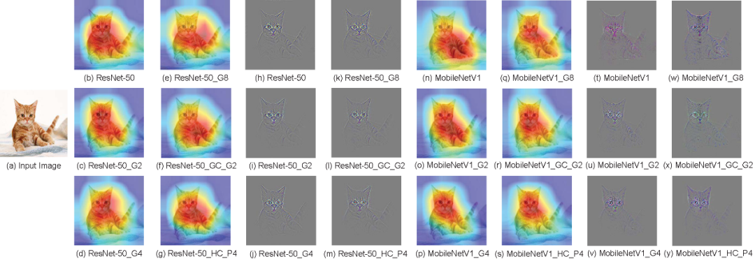 表6显示,DualConv能够降低MobileNetV2网络的推理时间。由于原MobileNetV2网络的反转残差结构将特征映射图激活两次,因此这可能是DualConv替换反转残差结构导致准确度降低的原因。图3展示了ResNet-50和MobileNetV1网络在ImageNet示例图像上的可视化结果。