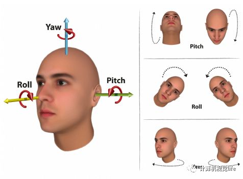 热身完毕,有没有对Demo上变化的数字费解呢?做过此方向的小伙伴,应该会比较容易理解,Head Pose Estimation 就是估计头部的姿态。详细道来:Head Pose Estimation 是通过一幅面部图像来获得头部的姿态角,跟飞机飞行有点类似,即计算 pitch,yaw 和 roll 三个欧拉角,分别学名俯仰角、偏航角和滚转角,通俗讲就是抬头、摇头和转头。百闻不如一见,上图示意