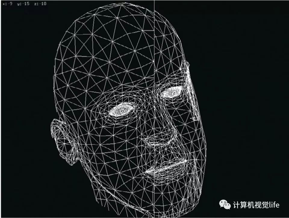 得到旋转矩阵后,就可以开心地去见欧拉角了:估计有些小伙伴犯嘀咕了:世界坐标系中点的位置怎么得到呢?一开始CV_Life君也苦恼这个问题,总不能每时每刻都要测一下人脸各个点在空间的位置吧,后来CV_Life君从各种论文中发现,原来大牛们在算法里面内置了一个3D人脸模型,把关键点的空间位置都标出来,就充当真实脸的空间位置;可是大牛又觉得这样不太合理,一个3D人脸模型不能表示所有人的脸,对所有人采用一个模型得到的精度肯定不好,于是便有了3DMM(3D Morphable Model),对不同人可以拟合出对应的3D脸模型,这样关键点的空间位置就比较准确了,Head Pose Estimation 的精度提上去了。但代价还是有的,计算量变大了,处理起来也就慢了。萝卜青菜各有所爱,速度和精度不可兼得,看你口味选择。一般的face Model如下所示,用一系列的点的坐标构建mesh。