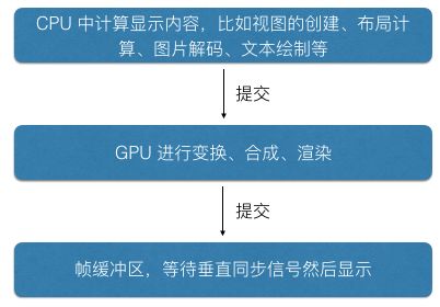 计算机系统的工作原理如上图所示:首先是CPU的工作,包括创建视图分配内存、计算布局、图片解码以及文本绘制等;接下来轮到GPU工作了,GPU负责视图变换、合成和渲染等;GPU渲染完提交到帧缓冲区中,等收到垂直同步信号后将帧缓冲区的内容显示到屏幕上。