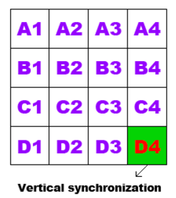 我们知道,远古时代的CRT显示器的显示原理是用电子枪扫描荧光屏来发光。如上图所示,电子枪按照从左到右,然后从上到下的顺序扫描。当电子枪换到新的一行准备进行扫描时,也就是上图A4、B4、C4、D4的位置,显示器会发出一个水平同步信号;而当一帧画面绘制完成后,电子枪回复到原位准备画下一帧前,也就是上图D4的位置,显示器会发出一个垂直同步信号。垂直同步信号的作用一方面是通知显示器回到A1位置,另外一方面,也通知显卡,准备输出下一帧画面。现在已经是液晶显示器的时代了,不再使用电子枪扫描了,但是原理还是类似的,水平同步信号和垂直同步信号还是一样被使用的。
