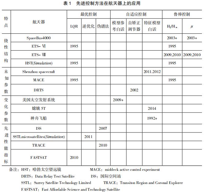 围绕高指向精度和快速机动能力两方面需求,先进控制理论在航天器上的应用主要面临航天器挠性、未知参数大范围变化、未知参数快速变化、以及日益提升的性能需求。与此同时,缺乏精确的对象和环境模型,以及缺乏充分的地面物理实验,是制约先进控制方法在实际工程应用的核心难点。值得欣慰的是,在航天器对先进控制方法迫切需求的发展趋势下,国内外始终有一些学者和工程师们致力于将先进控制方法引入航天器的控制系统中。参考文献[2]分析总结了当前先进控制方法在航天器上的应用现状,特别是那些已经得到了在轨验证的先进控制方法。相关分析统计结果如表 1 所示。从表 1 中,我们可以看出对于几类典型航天器,先进控制方法的适用范围具有如下规律: