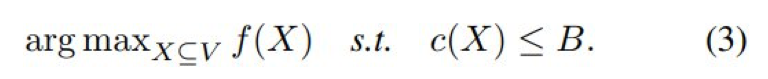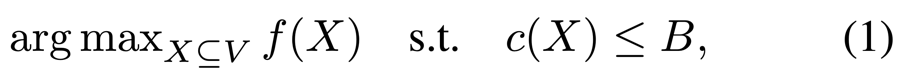 以及单调成本函数 c : 2^V →R^+ 和预算 B,目标是找到: