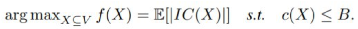 给定预算 B,影响力最大化的目标是找到 V 的一个子集 X,使得由源自 X 的传播而激活的节点的预期数量最大。
