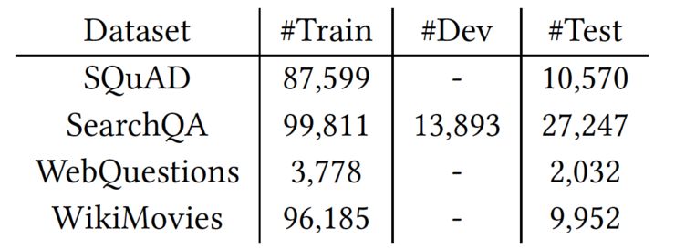 本文采用了四个被经常使用的数据用以评估所提出的模型,分别是 SQuAD, SearchQA, WebQuestions, WikiMovies。关于这几个数据集的一些信息如下表: