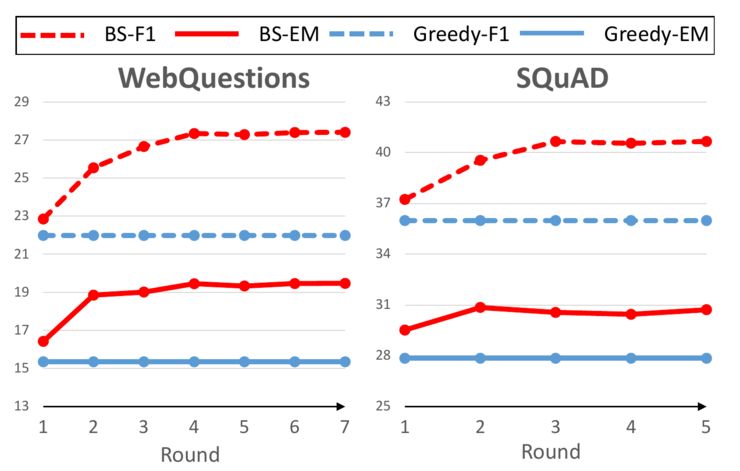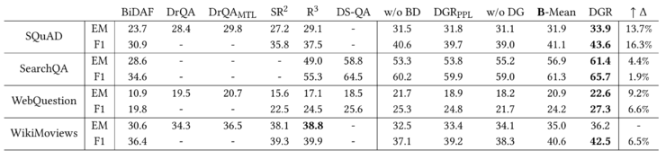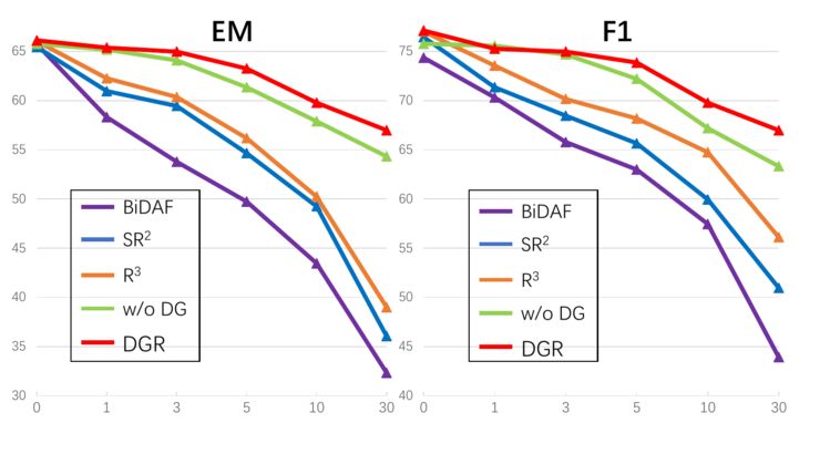 可以看到,不同的模型在加入噪声文档之后,没有用全局归一化的模型效果显著地降低,这个现象也被很多以前的多文档问答工作所证实。而由于我们使用了全局归一化进行训练,因此模型受噪声影响较小。