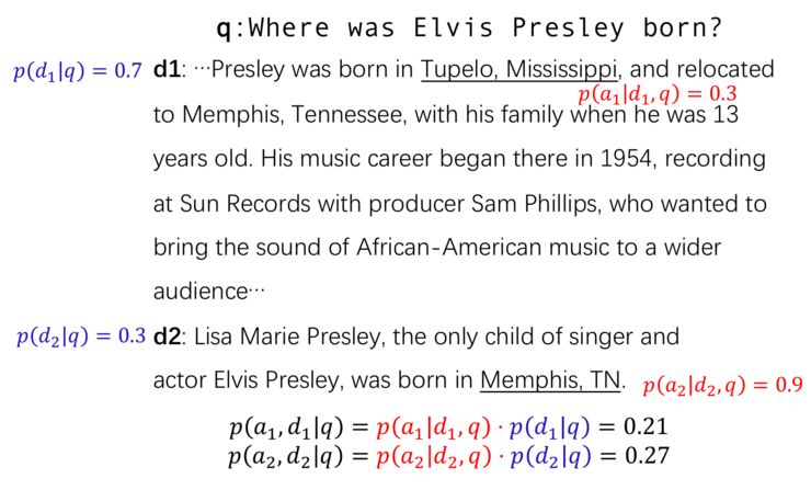 其次,很多以前的方法都没有考虑到答案概率的归一化:每一篇文档单独抽出来一个答案,以及这个答案的概率,最后各个文章的中的答案直接比较概率得到最终的答案,然而,这种过程会存在严重的答案概率偏置问题,如下面这个例子: