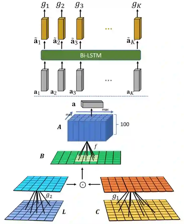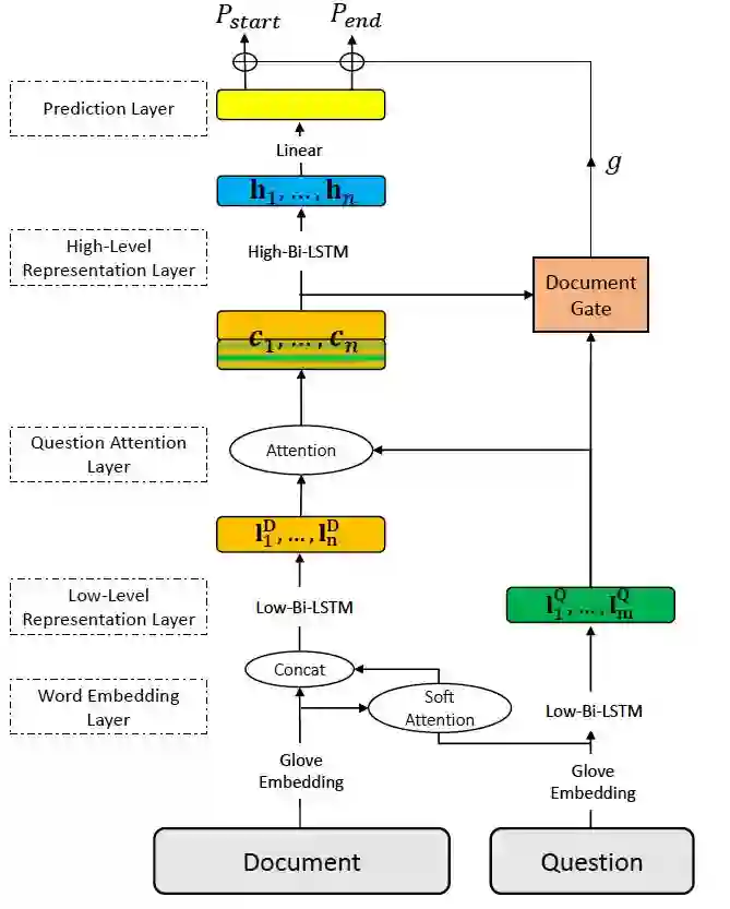 其中,文档和问题的建模过程和传统的机器阅读理解模型类似,是基于注意力机制的双向 LSTM。包含有词表示层,低级表示层,问题关注层,高级表示层以及答案输出层。