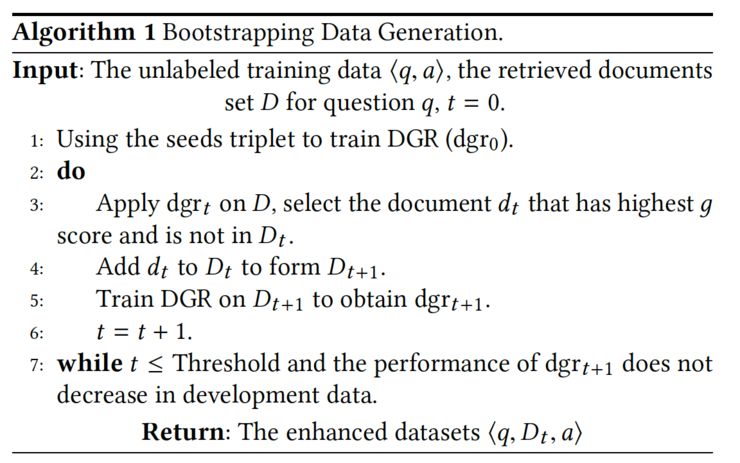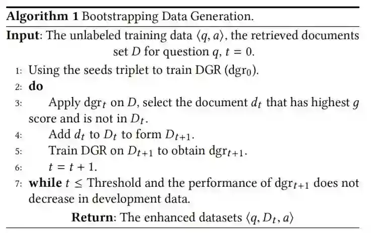 为了解决传统弱监督数据中存在的噪声较大的问题,我们使用了一种基于自举法(bootstrapping)的数据生成方法。具体来说,我们首先根据一些置信度较高的数据当成种子数据,例如,在 SQuAD 中种子数据可以是提供的最佳答案,在一些其他类型数据中可以是经过检索模型打分最高的。然后,在这个种子模型中我们预训练我们的模型,然后依靠上述的文档控制器的得分可以从未标注的弱监督数据中选择出分数较高的文档,加入到训练集里面继续训练。整个过程如下: