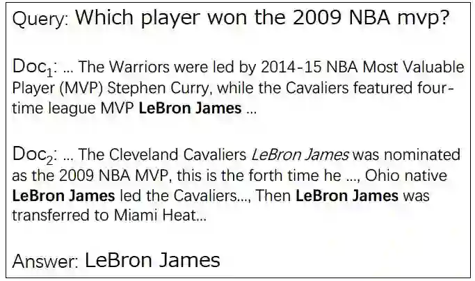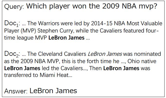 其中文档一包含了正确答案(Lebron James),但是却和问题不相关。文档二虽然包含了多个正确答案的,但是其中很多都不能用来回答问题。