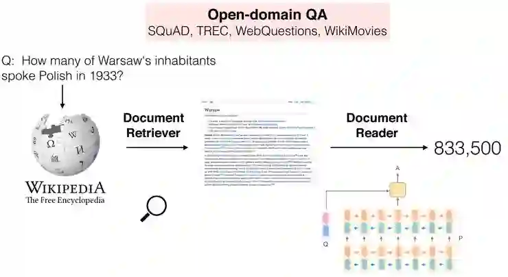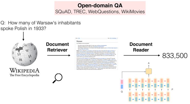 开放域问答(open-domain question answering)技术旨在给定任意类型的问题后,从任意资源中取得答案。传统的开放域问答大多采用 pipeline 的方式,即先通过检索系统找到跟问题相关的文档,再通过问答技术从文档中产生答案。最近几年,随着机器阅读理解技术的发展,越来越多开放域问答的方法引入机器阅读理解技术来抽取答案。例如,在 ACL2017 上斯坦福大学提出了一种神经开放域问答框架,如下图: