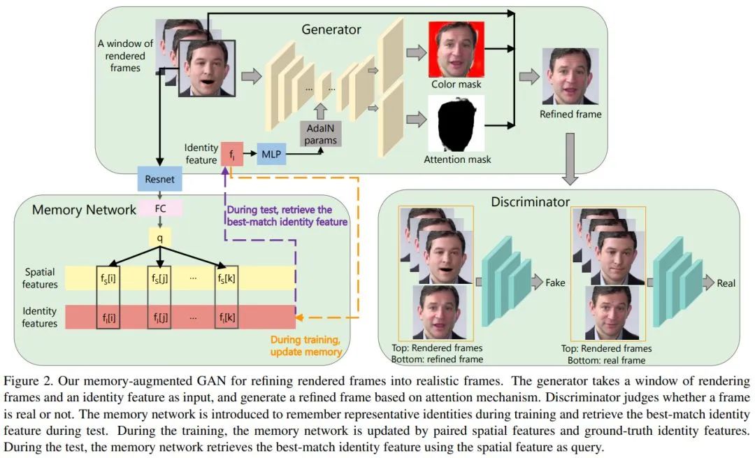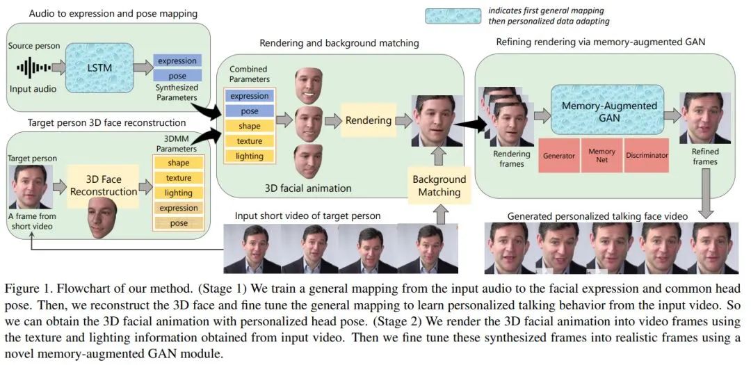 本文通过提出一个深度神经网络模型来解决此问题,该模型将源人的音频信号A和目标人的非常短的视频V作为输入,并输出合成的高质量说话人脸视频,其具有自然的头部姿势(利用V中的视觉信息),且表情和嘴唇同步(同时考虑A和V)。该项工作最大的挑战是自然的头部姿态包含平面内外的头部旋转,为了解决这个问题,作者重建出3D人脸动画并将其重新渲染为视频序列,为了平滑过渡这些视频的背景图使得结果更加逼真,作者提出了一个新颖的内存增强的GAN模块。