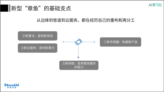这个话题背后,可以有一个抽象的概括,那就是我们的计算模式已经从水母的模式跳转到章鱼的模式,水母和章鱼的差异主要是什么呢?水母并没有强大的爪子,而且智商也不高,章鱼正好大脑变强大了,相当于现在负责云端的这部分正在融入越来越多的人工智能算法,其次是章鱼的爪子足够强大足够灵活,落到现实就是更多对周围环境的感知。之前的云服务更多是水母型的云服务,并不真的感知周围的环境产生某种响应,之后同自己的云端相连接,而章鱼型的云服务明显是一种新形态的云服务。”