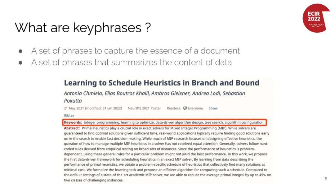 关键短语以短语列表的形式表示文本中最重要的信息,它通常可以作为有效总结文本文档的代理。近年来,随着深度神经网络技术的发展,关键词自动识别技术得到了迅速发展。随着自然语言理解的进步,以及自然语言生成技术使模型能够预测文本中未提及的相关短语,关键词提取方法的性能得到了极大的提高。我们将总结文本的任务命名为关键词提取。