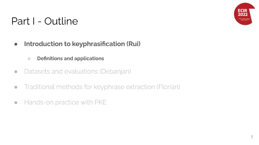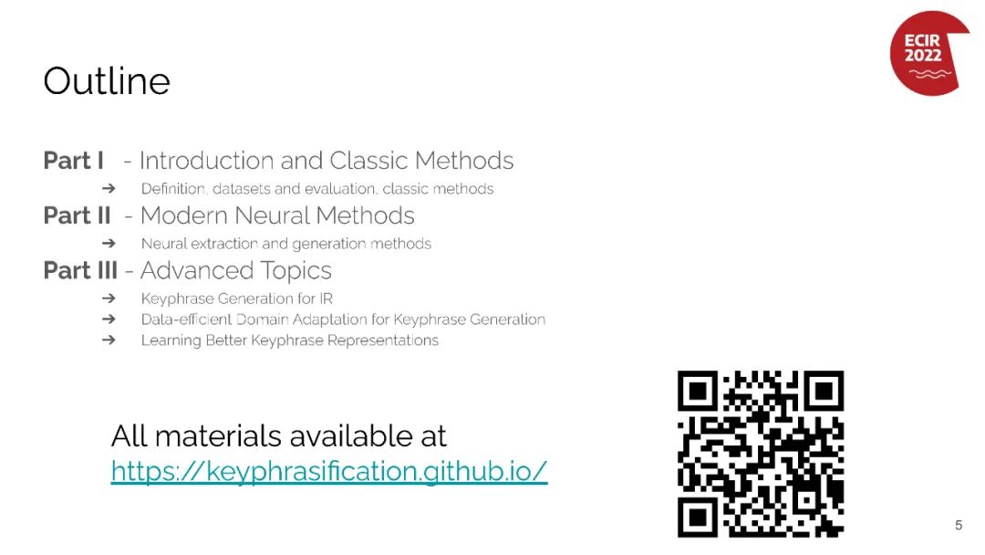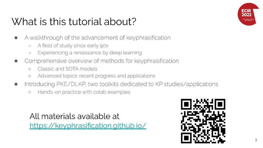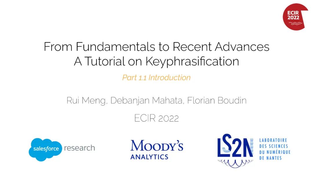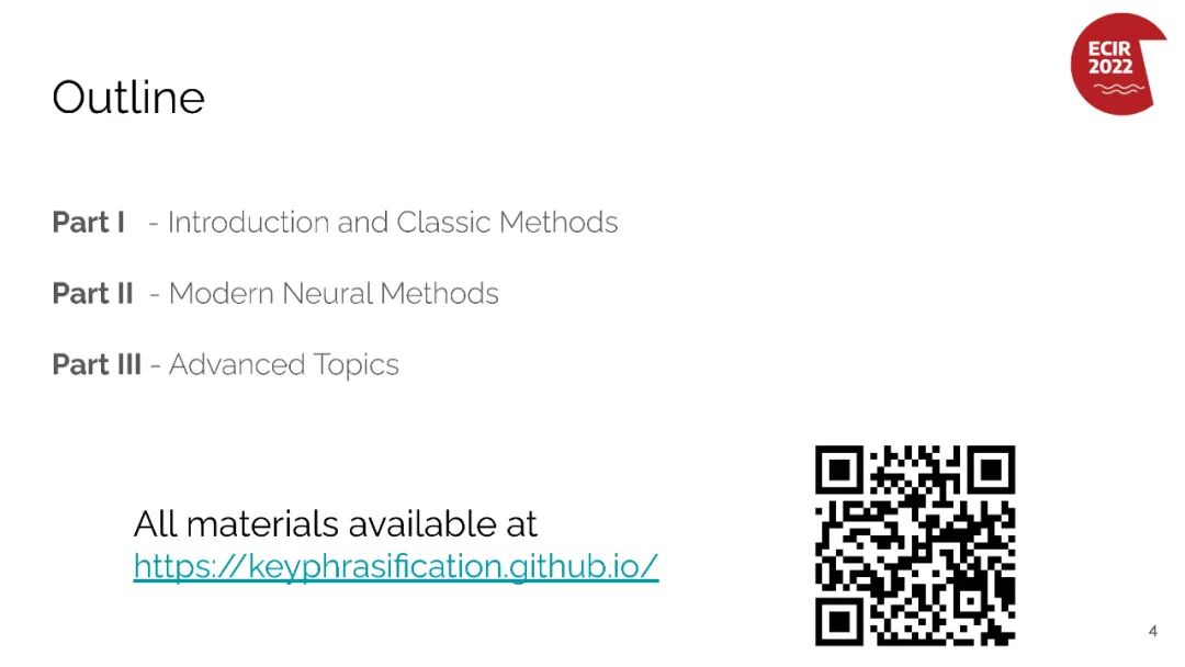在这个半日的教程中,我们提供了一个关于关键词提取的全面概述,以及使用流行的模型和工具的实践。本教程涵盖了从基本任务到高级主题和应用的重要主题。在课程结束时,学员将更好地理解1)经典的和最先进的关键词提取,2)当前的评估实践及其问题,以及3)当前的趋势和未来的关键词提取研究方向。