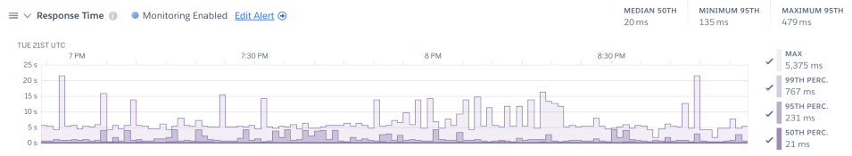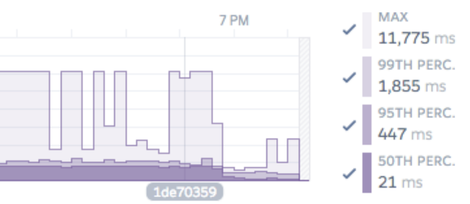 50 个百分位通常低于 100ms,因为许多请求都是能够快速完成的 API 端点。99 个百分位超过 20 秒也没有问题,因为一些管理页面需要好一会儿才能完成。我真正关心的是 95 百分位——我们希望 95% 的请求能够在 3 秒内完成。这 95% 代表了大部分客户的请求和参与,也代表了捐赠者的体验。