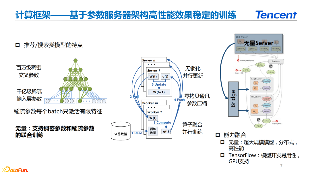 在面对算法人员提供模型训练和建模能力时,无量系统主要是将参数服务器和TensorFlow的能力进行了融合。在server端对参数服务器参数获取和TensorFlow模型计算的能力进行桥接。在无量系统中比较完整地复用了TensorFlow的图构建以及自动求导能力,使得TensorFlow用户能够花费极小的学习成本掌握无量系统的使用。无量通过这种桥接方式能够完成高性能分布式模型训练和GPU部署能力的支持。
