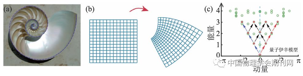 图2 (a)“标度不变”的鹦鹉螺贝壳近似形成等角螺线;(b)一个典型的共形变换,(a),(b)图片来自维基百科;(c)临界点上的量子伊辛模型精确对角化得到的(低能)能谱很好地符合共形场论的预言,形成Virasoro 塔结构。Virasoro 塔上的量子态根据动量可以分出左、右手征,中线上则为无手征态