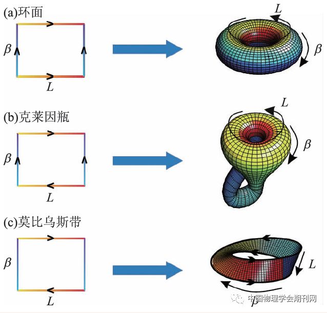 图3 3 种两维流形上的路径积分,箭头方向代表粘接方式。当两边为周期边界条件时,按照平直和扭曲粘合得到(a)环面和(b)克莱因瓶。一边为开边界条件、另一边为周期边界条件,扭曲粘合,得到(c)莫比乌斯带