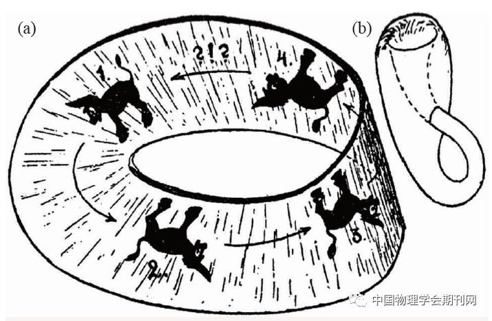 看似平淡无奇的一扭赋予了莫比乌斯带和克莱因瓶非同寻常的拓扑性质。而把这些流形想象成世界的话,在其中生活的生命也会体验到奇妙的物理性质。著名理论物理学家伽莫夫在他的经典科普著作《从一到无穷大》中论述了有手征的物体在莫比乌斯带上旅行的有趣体验[1]。对于不对称物体,我们总可以分出其手征,例如手套可以分出左手系和右手系,它们“非常相似但又极为不同”。图1(a)所示的非对称纸片驴也有手征:在莫比乌斯带1 号位置的纸片驴是“左手的”[2],如果不把驴拿开纸面,无法通过在纸面内原地旋转而改变其手征。如图1(a)中所示,我们从三维空间看过去,纸片驴按照箭头所示的逆时针来运动,当纸片驴历经2—3—4 回到1 位置的时候,我们发现纸片驴四脚朝天, 如果将它“ 正过来”,会惊讶地发现二维驴变成了“右手系”!我们从三维空间来观察,能够获得非常全面的视角,清楚地了解到纸环是否有扭曲。但是二维的纸片驴并不能轻易知道它生存的空间是通常的纸环还是莫比乌斯带。它唯有环游世界,回到原来局域的坐标架下来观察自己手征的改变与否,才能判断空间的整体性质。