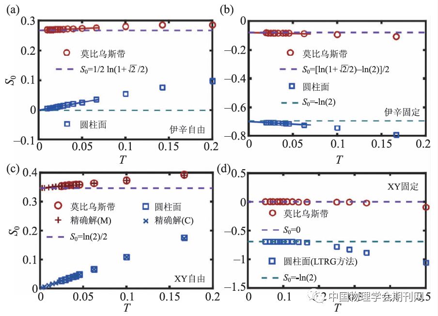 图6 张量网络计算莫比乌斯带和圆柱面上的普适熵[6],后者即著名的Affleck—Ludwig 边界熵。(a)和(b)为量子伊辛模型在自由和固定边界下的计算结果;(c)和(d)为XY 模型(哈密顿量H= -Σisixsi+1x+siysi+1y ,其中six,y为自旋-1/2 算符的x,y 分量)在两种边界的数值以及部分解析结果。从这些计算中,我们精确验证了莫比乌斯带上的零点熵是普适的,并且是克莱因瓶熵与相应Affleck—Ludwig边界熵的和的一半