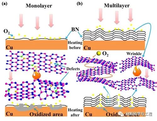 图2 单层和多层六方氮化硼包覆铜箔的界面损伤机制