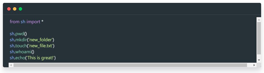 sh 库允许你像普通函数一样调用任何程序,这点对于自动化工作流和任务非常有用,所有这些都来自 Python 内部。