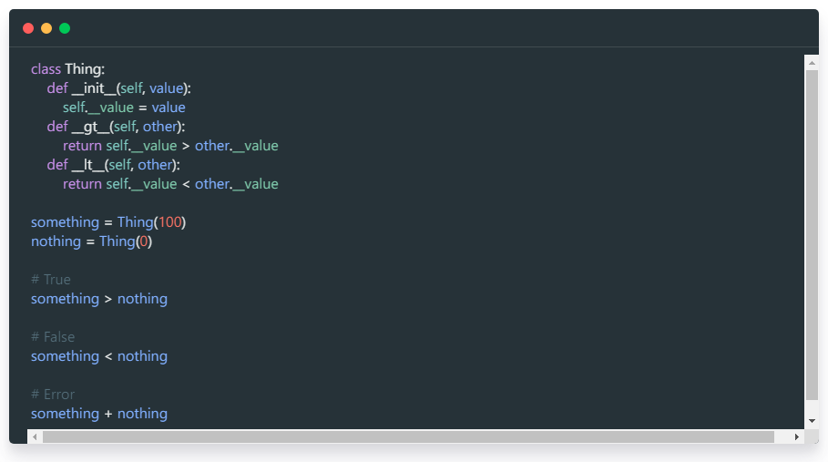 你可以按照自己的特定方式定义使用 Python 标准运算符符号的对象。这样,你就可以在正在使用的对象相关的上下文中使用它们。