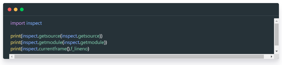 如下所示的代码段,使用了 inspect.getsource() 来打印自己的源代码。它还使用了 inspect.getsource() 来打印定义它的模块。
