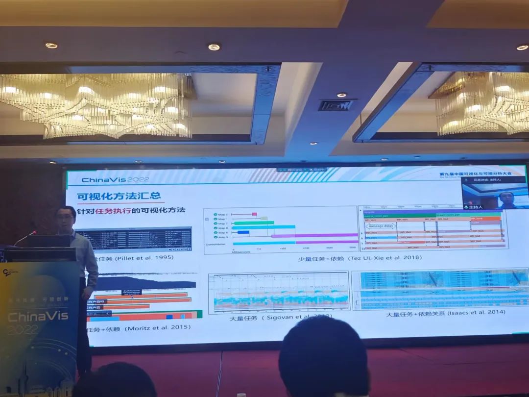 论文报告Session 2 “AI4VIS”中,报告嘉宾分别报道了4项相关研究工作。浙江大学的学者提出基于深度学习的框架来自动发现视觉洞察并为图表生成相应的文本描述,开发了一个交互系统用于显示图表见解以及相关描述。东北师范大学的学者介绍了一种辍学行为的模式识别方法,可以定量地揭示不同学习行为对于辍学的影响。天津大学的学者分享了一种用于构建大数据可视化系统的混合预测和搜索方法,以灵活和高效地探索投标数据。重庆大学的学者提出通过深度嵌入和视觉探索对时间序列数据进行呈现和分析,在不同的数据集量化实验和可视分析案例研究评估得到较好的效果。