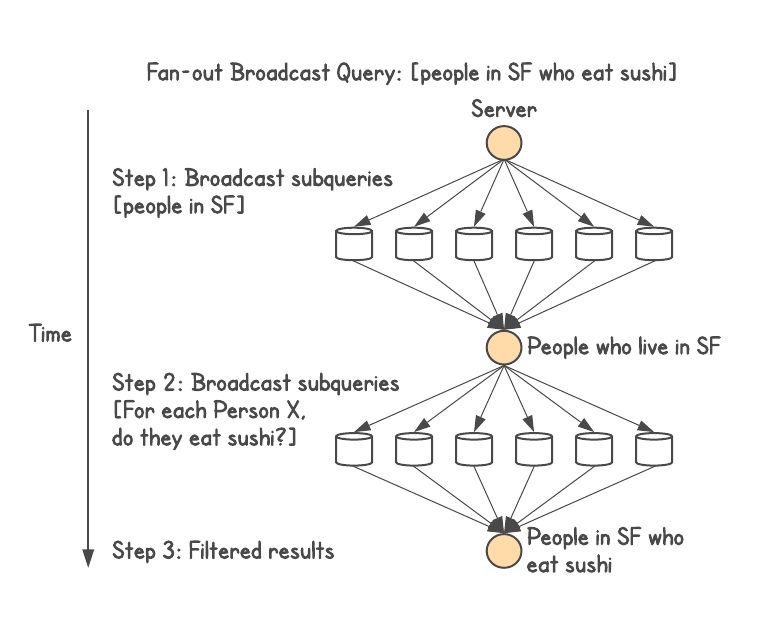 第二步是出现扇出问题。如果第一步有一百万个结果(所有旧金山人口),那么第二步需要将每个结果放入查询中,检索他们的饮食习惯,然后通过过滤器过滤出符合条件的人。