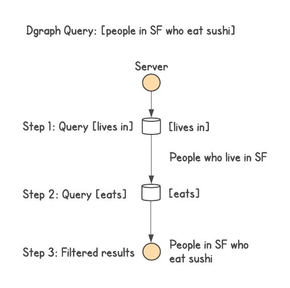 这实际上允许了查询执行任意深度连接,同时避免扇出广播问题。比如查询[people in SF who eat sushi],会导致数据库内最多进行两次网络调用,无论集群规模大小。第一个调用会找到所有住在旧金山的人。第二个调用会发送这个人名单并与所有吃寿司的人求并集。我们还可以添加更多约束或扩展,每个步骤仍然会涉及最多一个网络调用。