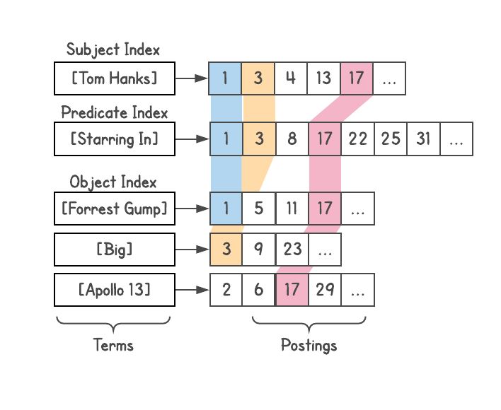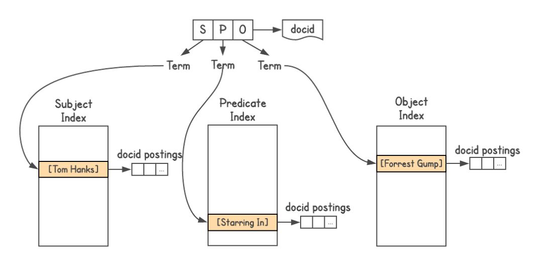 我使用了Google的搜索索引系统,为每个三元组分配了一个Id,并构建了三个索引,分别为S,P和O.另外,索引允许附件,所以我附上了每个实体的类型信息(即演员,书,人等等)。