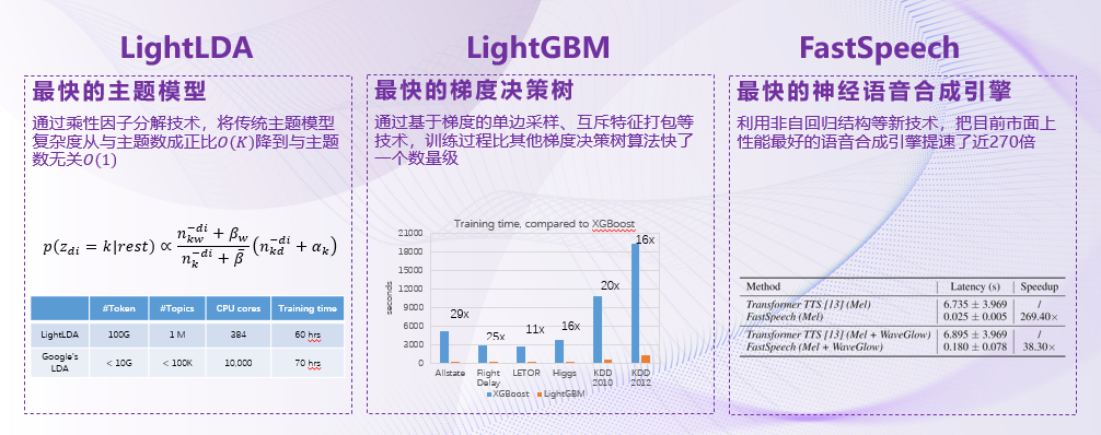 作为研究人员,我们不禁自问:人工智能要发挥威力,一定需要消耗巨大的计算资源吗?过去的5年里,我们基于这样的思路,开发了一批高效实用的低功耗人工智能技术,包括让计算复杂度与主题数目无关的高效主题模型 LightLDA,只需300个 CPU内核,就训练出了比以往要用上万个内核才能训练出的模型还要大若干数量级的新模型;速度快、准确率高、内存要求低、分布式支持还可轻松快速处理海量数据的LightGBM 算法,实现了比市场上最好的梯度决策树算法还要快一个数量级的新算法;兼具快速、鲁棒、可控等优点的语音合成算法 FastSpeech,将性能最好的语音合成引擎提速了近270倍,而且只需要使用低端 GPU 就可以实现实时的语音合成服务。
