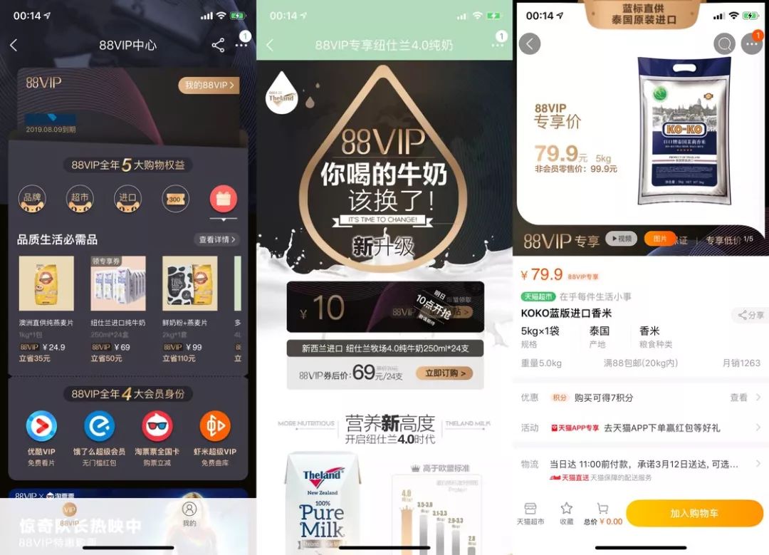 88 会员的专属价相比京东真是少得可怜了,从最初上线到现在也未曾变过几样,主要集中于米、油、牛奶、纸巾等日常开销上,有一些似乎是独家销售渠道,价格无从比对。我尝试了几款可对比的商品,与京东差价在 2~15 元不等,不过部分商品属天猫超市的范畴,想到要凑单到 88 元,我不是很想薅这个羊毛。