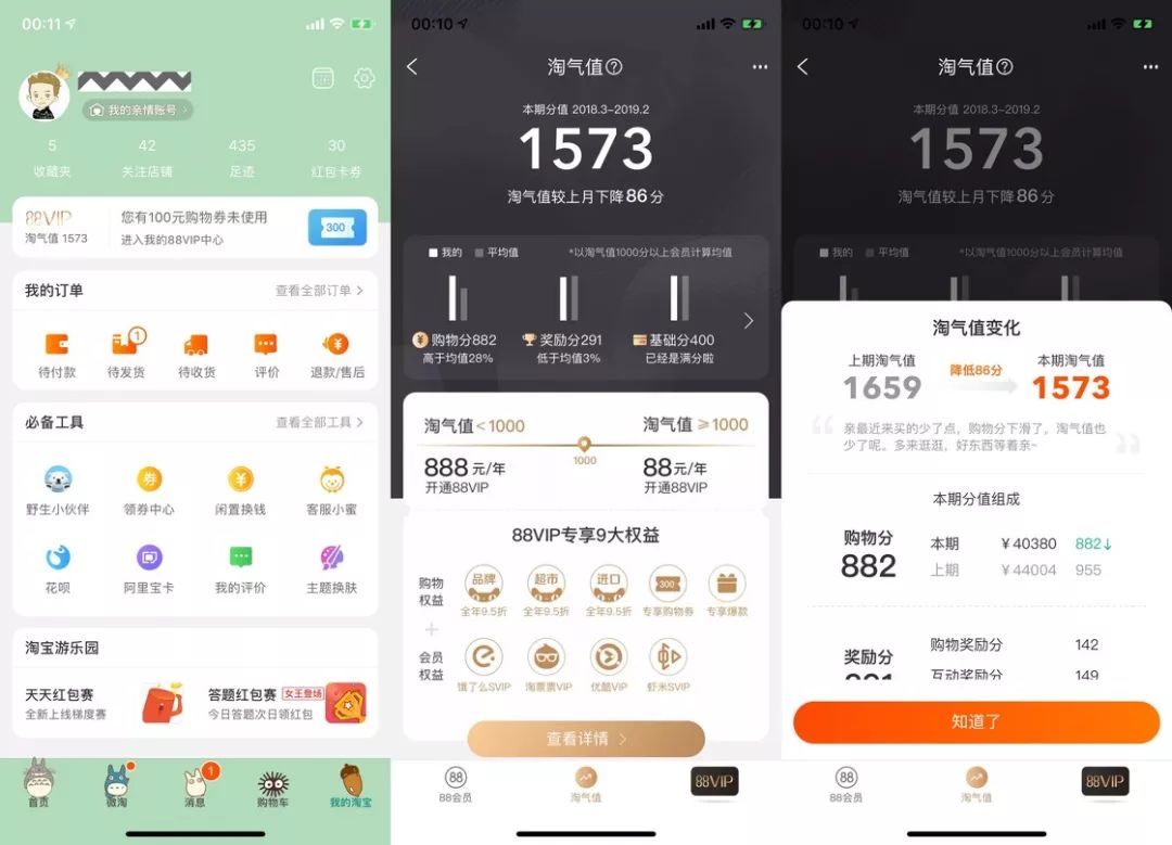 如果你没有被初期暴风雨一般的宣传「蛊惑」,现在仍可以从手机淘宝或手机天猫的个人页订阅 88 会员服务。淘气值高于 1000 的用户能以 88 元一年的价格订阅,而淘气值低于 1000 的用户订阅价则会暴涨至 888 元一年。